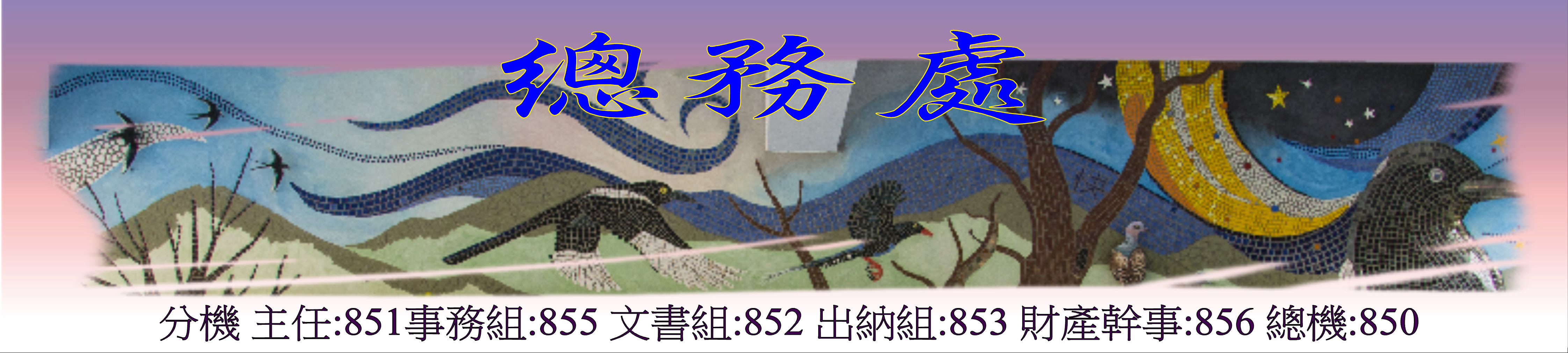 1.承辦勞、健保相關業務。 2.就服站人員薪水月底核銷事宜。 3.辦理學校動產及不動產登記。 4.財產管理及財產報廢事宜。 5.財產盤點及交接事宜。 6.財產之撥出撥入。 7.省教育會工作事項。 8.校長、各處室主任臨時交辦事項。 |